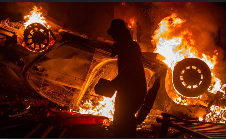 A group of protesters tried to tear down the gates of the unit, notorious for its heavy-handed tactics, and pulled a sign from the building’s facade in chaotic scenes.