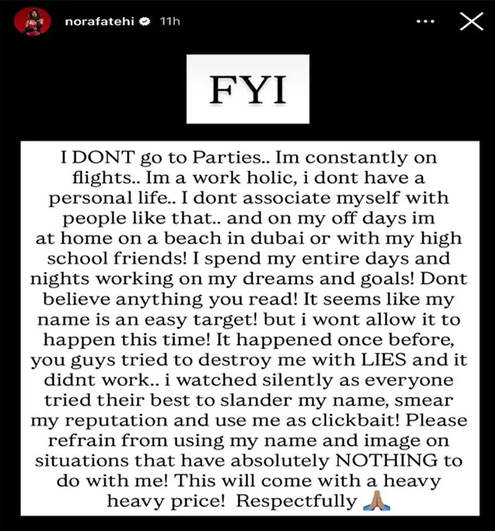 In a statement shared on Instagram, Nora labeled the reports as “false” and said her name was being wrongly associated with the matter.