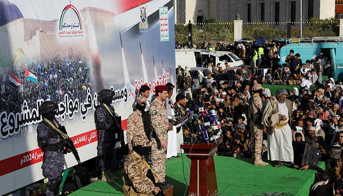 Houthi military spokesman Yahya Sarea delivers a statement as protesters, mainly Houthi supporters, rally to show support to Palestinians in the Gaza Strip, in Sanaa, Yemen, December 13, 2024. — Reuters